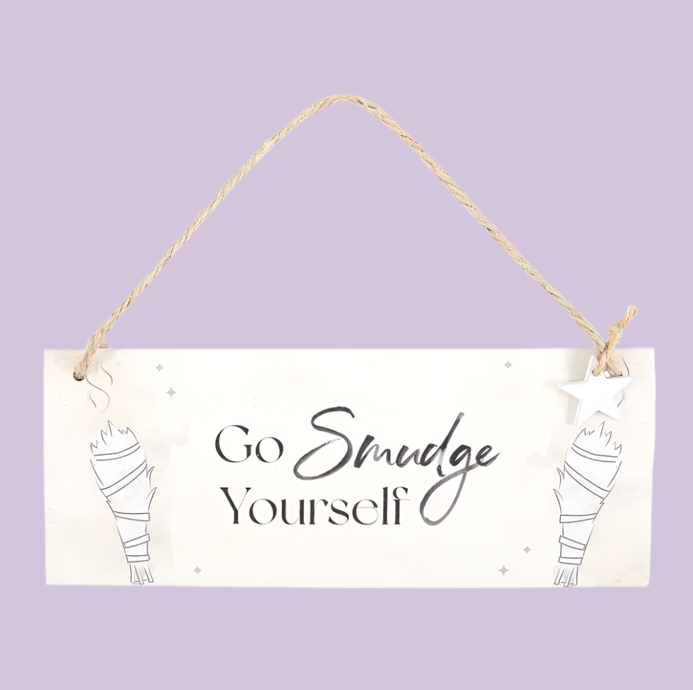 Add a dash of humor and a touch of charm to home and office surroundings with our MDF Hanging Sign with a Rope Hanger, featuring the fun phrase, "Go smudge yourself" and an illustration of smudge sticks.