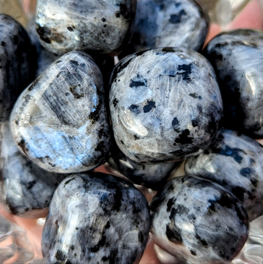 Larvakite is a member of the Labradorite family  with it's impressive blue flashes. Larvakite is known for properties such as aiding decision making, coming to turns with change and guidance with 'moving on'.